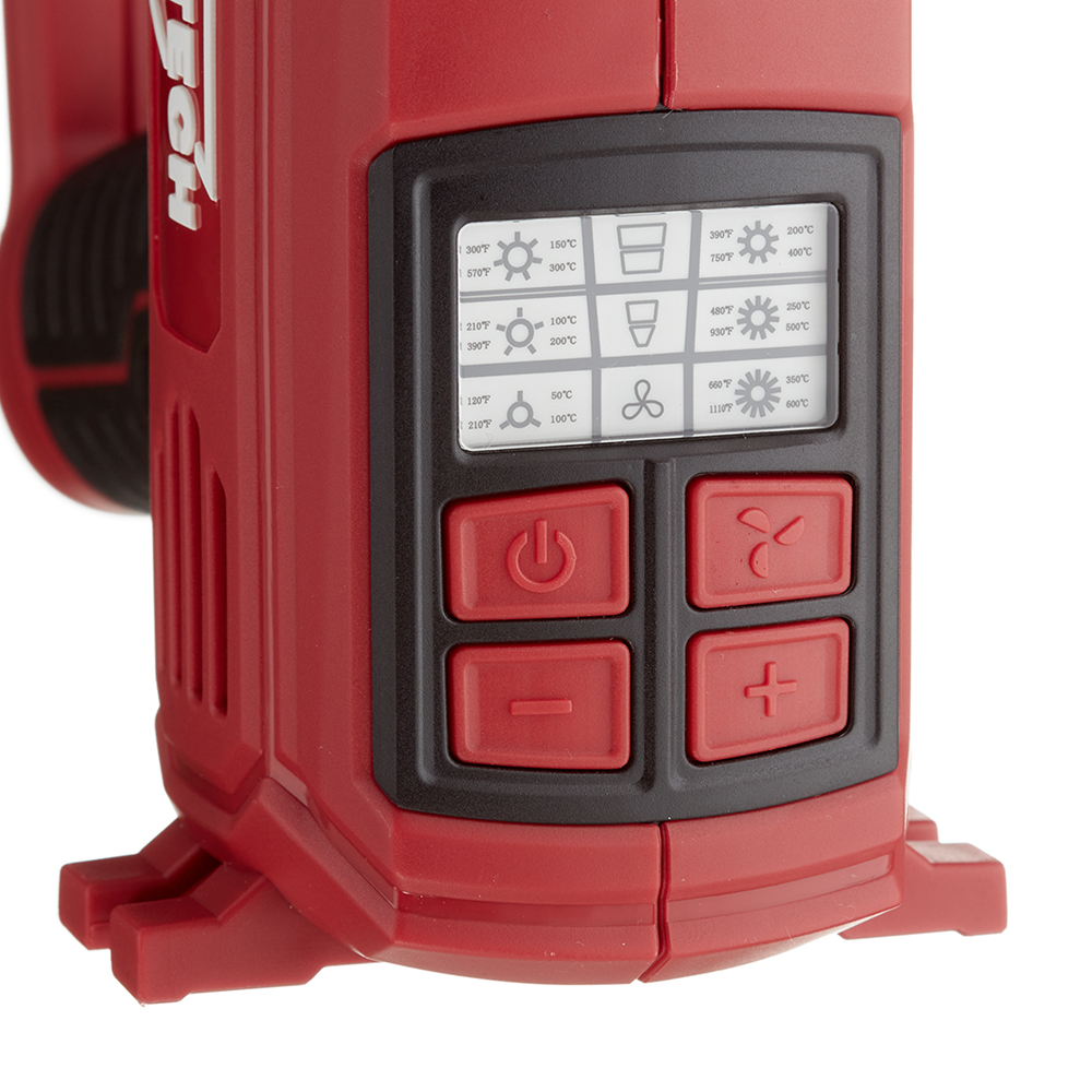 два режима работы, стандартный размер сопел, эргономичный дизайн, противоскользящие накладка рукоятки, регулировка рабочей температуры, защита от перегрева, светодиодная индикация рабочей температуры, функция принудительного охлаждения.