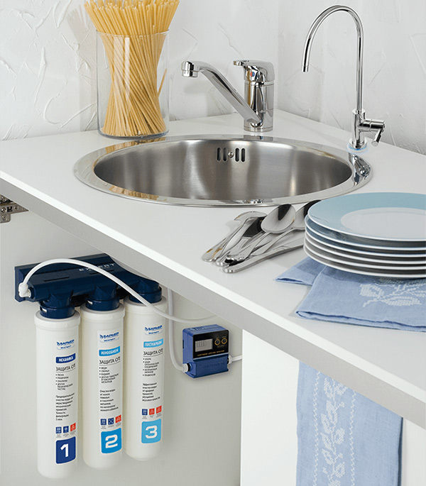 Корпус фильтра (блок крепления фильтроэлементов) – 1 шт.; Комплект фильтроэлементов из 3 шт. – 1 шт.; Кран для чистой воды с прокладками, шайбами, гайкой* – 1 шт.; Соединительная пластиковая трубка (белая) – 1 м²; Наклейка-шаблон для удобства подвеса фильтра – 1 шт.; Фитинг на кран для чистой воды – 1 шт.; Фитинг угловой – 2 шт.; Шаровой вентиль для подключения к водопроводу – 1 шт.; Саморезы для крепления водоочистителя к стене – 2 шт.; Индикатор ресурса с элементами для подключения – 1 шт.