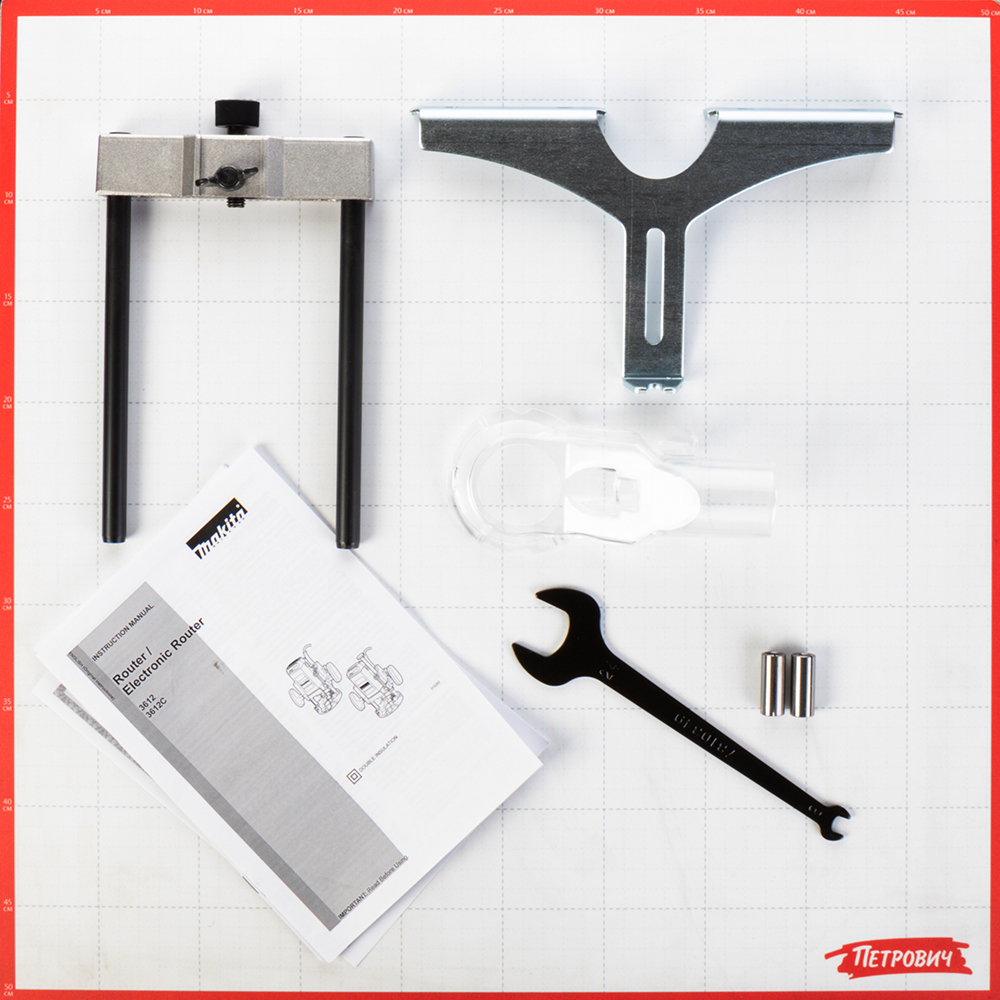 патрубок для пылесоса, две переходные втулки (6 и 8 мм), гаечный ключ (8x24мм), цанга 12мм, параллельный упор.