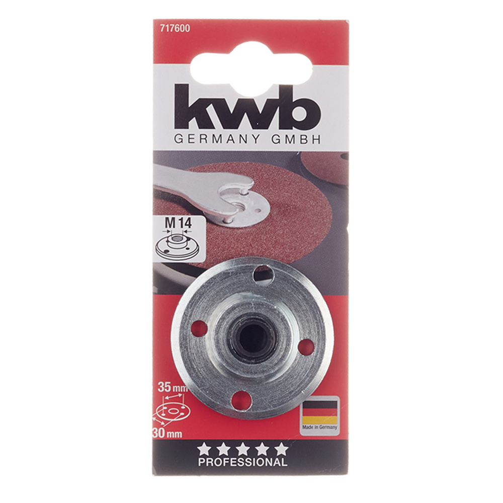 Предназначена для зажима абразивных дисков. Используется во всех угловых шлифовальных машинах со стандартным типом резьбы шпинделя М14. Для УШМ под ключ 30 мм и 35 мм