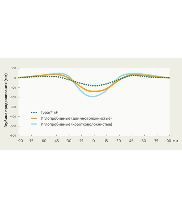 - При воздействии нагрузки Typar® демонстрирует меньшее удлинение, чем иглопробивные материалы. Это означает меньшую деформацию и меньшую колею, например, для грунтовых дорог или дорог на слабых основаниях.