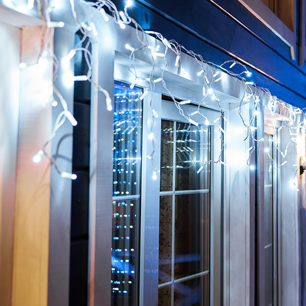 Гирлянда Бахрома(Айсикл) представляет собой гибкий горизонтальный шнур-шину, к которому через определенные промежутки крепятся вертикальные нити разной длины со светодиодами. Она имитирует сосульки и может послужить эффектным и оригинальным решением при декорировании карнизов домов, арок, фасадов зданий, витрин магазинов, а также стать элементов декора внутренних интерьеров помещений. rnБлагодаря использованию в гирлянде светодиодов, ее отличительной особенностью является превосходная яркость и низкое энергопотребление по сравнению с лампами накаливания. rnПри длине 4,8 метра гибкая направляющая имеет 48 вертикальных нитей от 10 до 60 см.rnДанная гирлянда имеет Белый цвет свечения и предназначена для использования как внутри помещения, так и снаружи.rnРаботает от сети 220 В