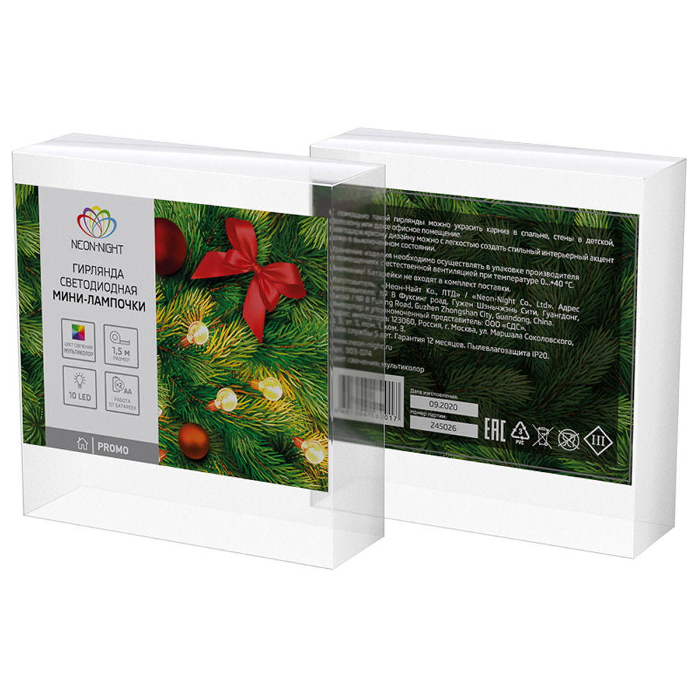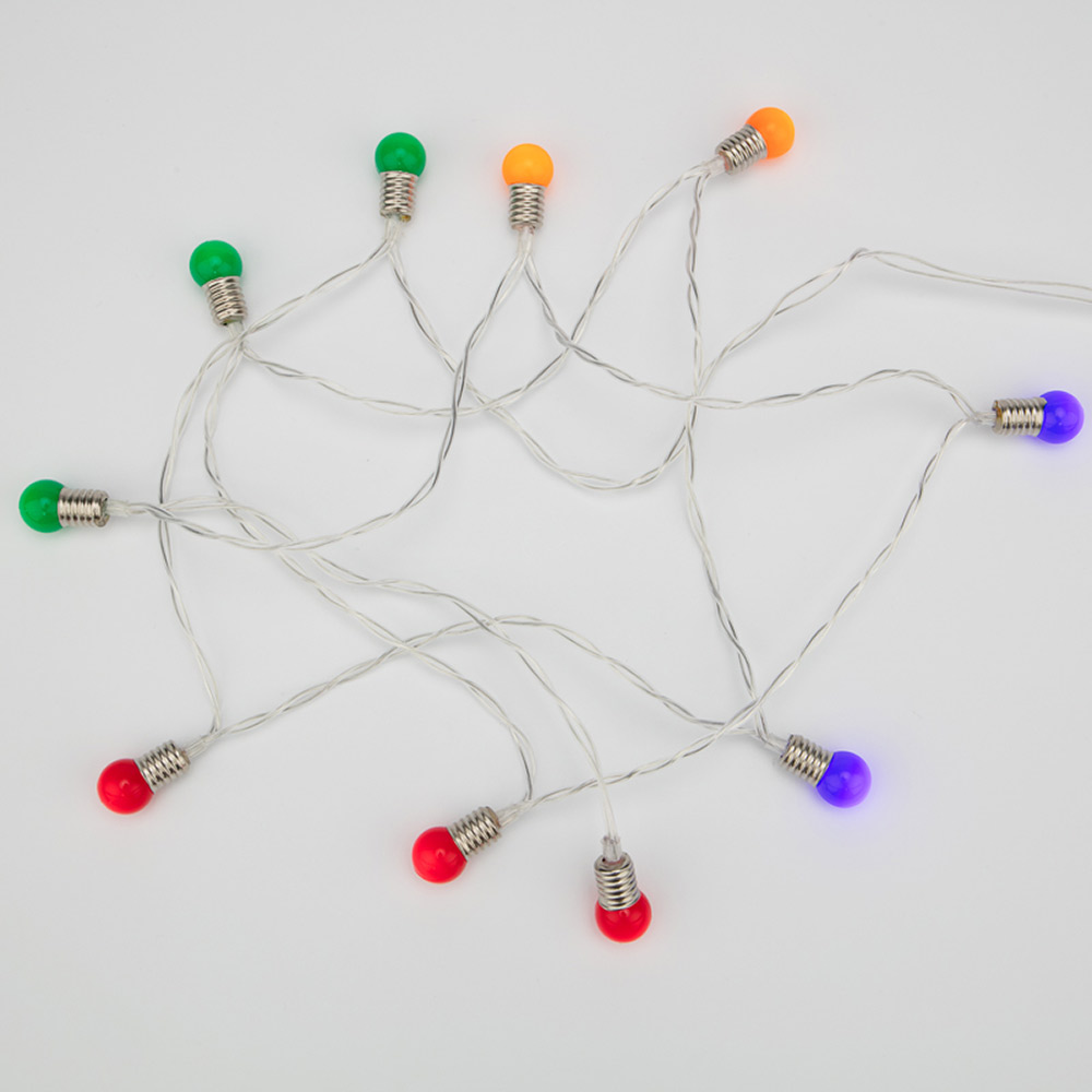 10 фонариков, на расстоянии 16,67 см. Работает от 2 батареек АА (в комплекте не идут).