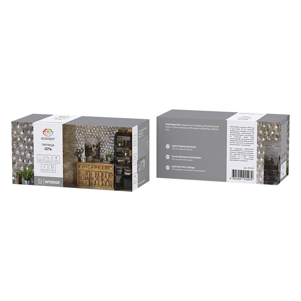 Предназначена для домашнего использования и идеально подойдет для украшения стандартного 3-х створчатого окна в квартире или офисе.Гирлянда-сеть представляет из себя прозрачное полотно в виде прямоугольника размером 1x1,5 метра, разбитого на равные ромбы, в углах которых находятся диоды белого цвета. rnГирлянда-сеть при использовании на окнах или других поверхностях позволяет осуществить равномерную засветку по всей площади, для этого достаточно ее растянуть по периметру, используя, например, присоски с крючком.rnРаботает от сети 220 В