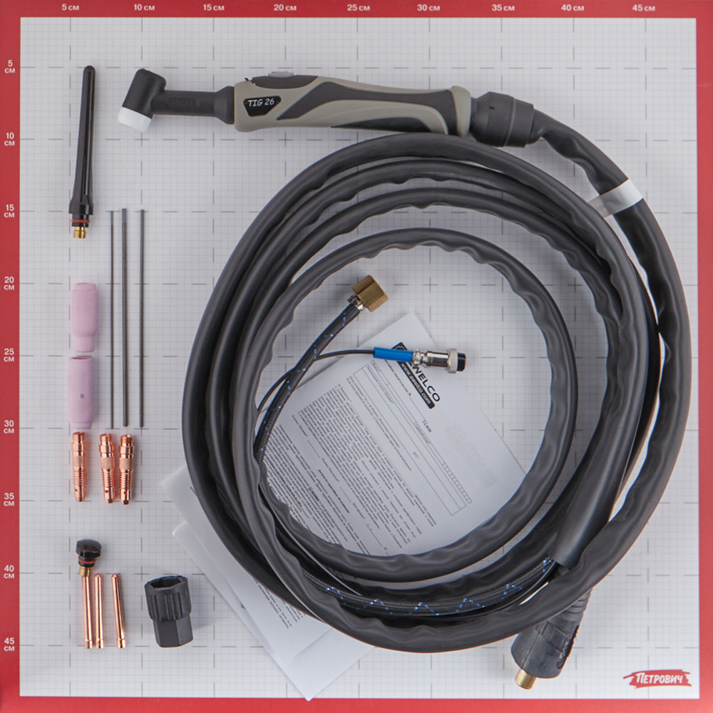 горелка TIG, колпачок (1 шт.), цанга для электрода: Ø 1.6 мм – 1 шт., Ø 2.4 мм – 1 шт., Ø 3.2 мм – 1 шт., вольфрамовые электроды: Ø 1.6 мм – 1 шт., Ø 2.4 мм – 1 шт., Ø 3.2 мм – 1 шт., держатель цанги: Ø 1.6 мм – 1 шт., Ø 2.4 мм – 1 шт., Ø 3.2 мм – 1 шт., керамическое сопло: Ø 5 мм и Ø 8 мм, картонная коробка.