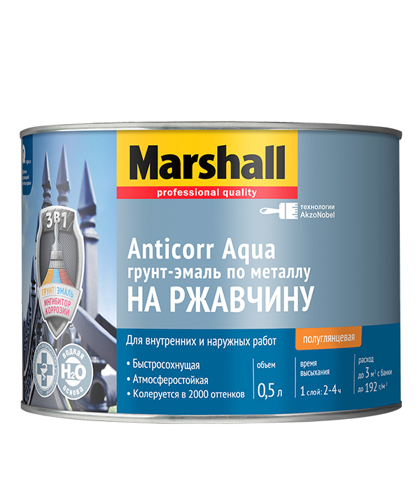 Грунт-эмаль по ржавчине Marshall Anticorr Aqua основа BС полуглянцевая 0,5 л