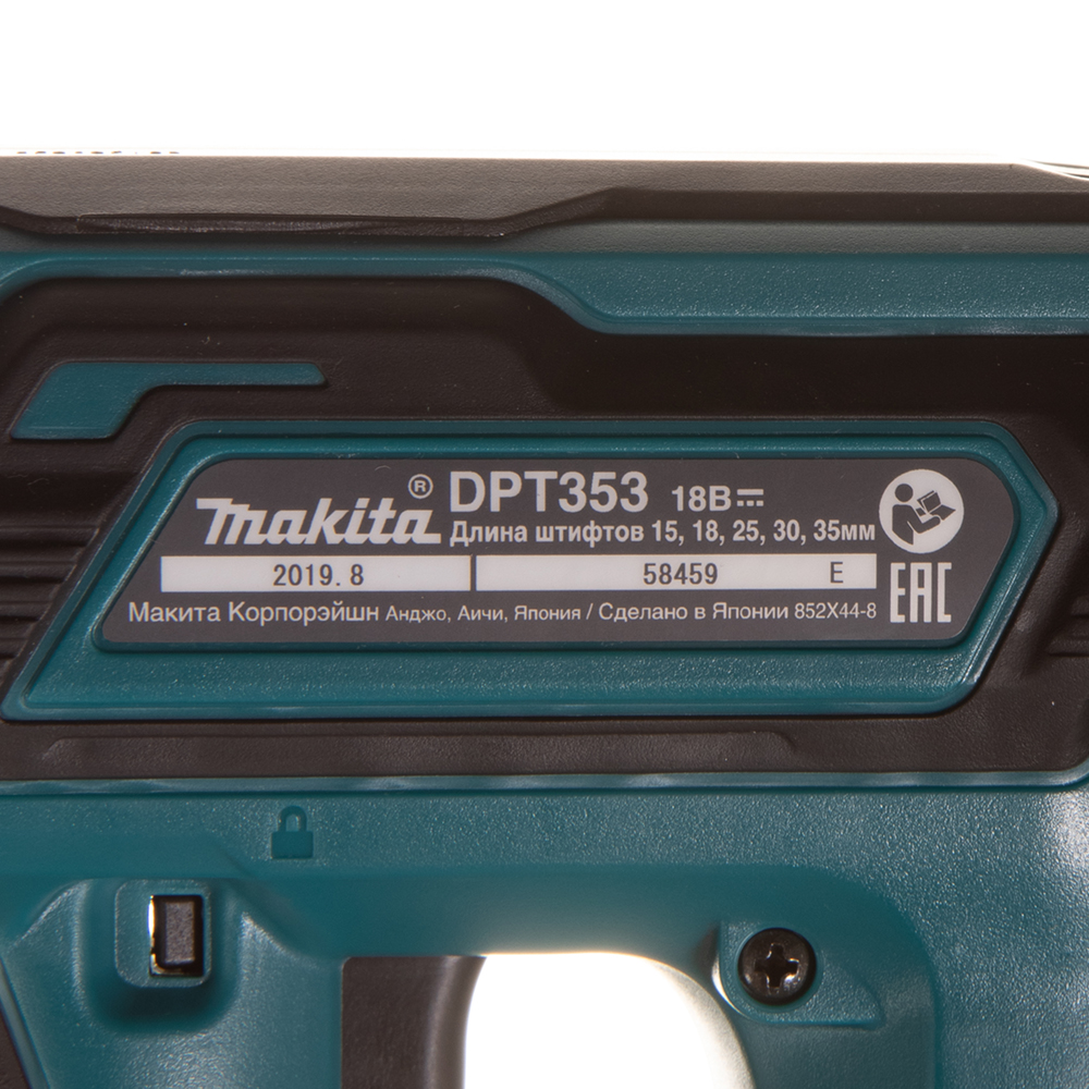 Аккумуляторный штифтозабиватель (пин нейлер) Makita DPT353Z предназначен для серийного крепления материала к деревянной основе. Длина штифтов 15-35 мм, регулировка глубины забивания от 1,5 мм, защита от «холостого выстрела». Емкость в инструменте Makita DPT353Z – 100 гвоздей, причем их оставшееся количество можно увидеть через смотровое окно с помощью красного индикатора, перемещающегося при увеличении расхода к отверстию для крепления. Автоматика инструмента следит за тем, чтобы при их отсутствии «выстрел» не производился. Выключатель при этом перестаёт нажиматься.