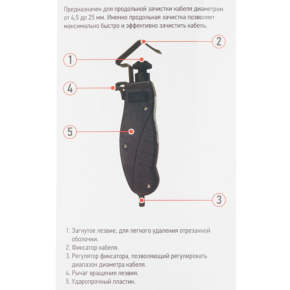 Предназначен для продольной зачистки кабеля диаметром в диапазоне от 4.5 – 25.0 мм.rnИменно продольная зачистка позволит максимально быстро и эффективно зачистить кабель.rnПри работе с этим инструментом есть возможность снять оболочку в любом месте подавляющего большинства распространенных кабелей с диаметром от 4.5 до 25.0 мм.rnЗагнутое лезвие позволит с легкостью удалить отрезанную оболочку.rnУдобная ручка обеспечит максимально эффективное использование инструмента, нагрузка на руку будет сведена к минимуму.
