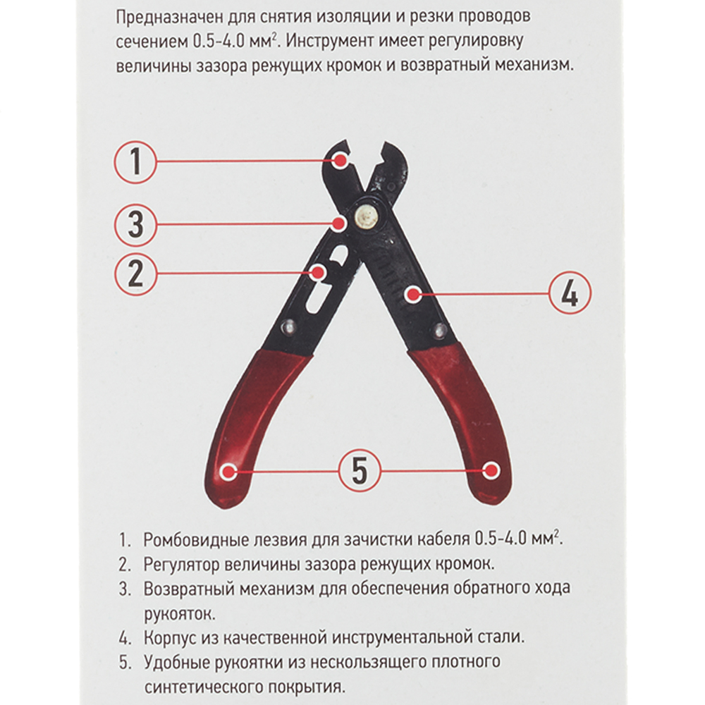 Предназначен для снятия изоляции и резки проводов сечением 0.5 – 4.0 мм².rnКорпус выполнен из качественной инструментальной стали с регулировкой величину зазора режущих кромок и возвратным механизмом.rnРежущий профиль регулируемый ромбовидный.rnУдобные эргономичные рукоятки выполнены из нескользящего плотного синтетического покрытия, они сделают работу с инструментом легкой и приятной.