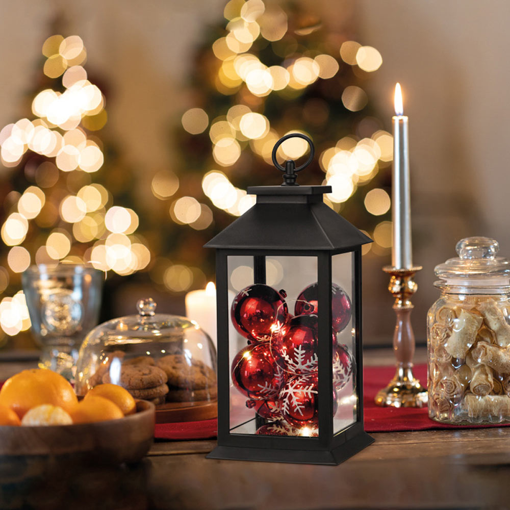 Декоративный фонарь с шариками предназначен для украшения праздничного и повседневного интерьера, подарит ощущение комфорта в зимний вечер. Оригинальное изделие в корпусе черного цвета станет стильным дополнением праздничной обстановки.rnДля подвешивания предусмотрено кольцо в верхней части. Экономичные диоды, подсвечивающие композицию, излучают теплый белый свет.rnВ качестве элементов питания используются 3 батарейки тип ААА, которые делают фонарь мобильным – для работы не нужна розетка.
