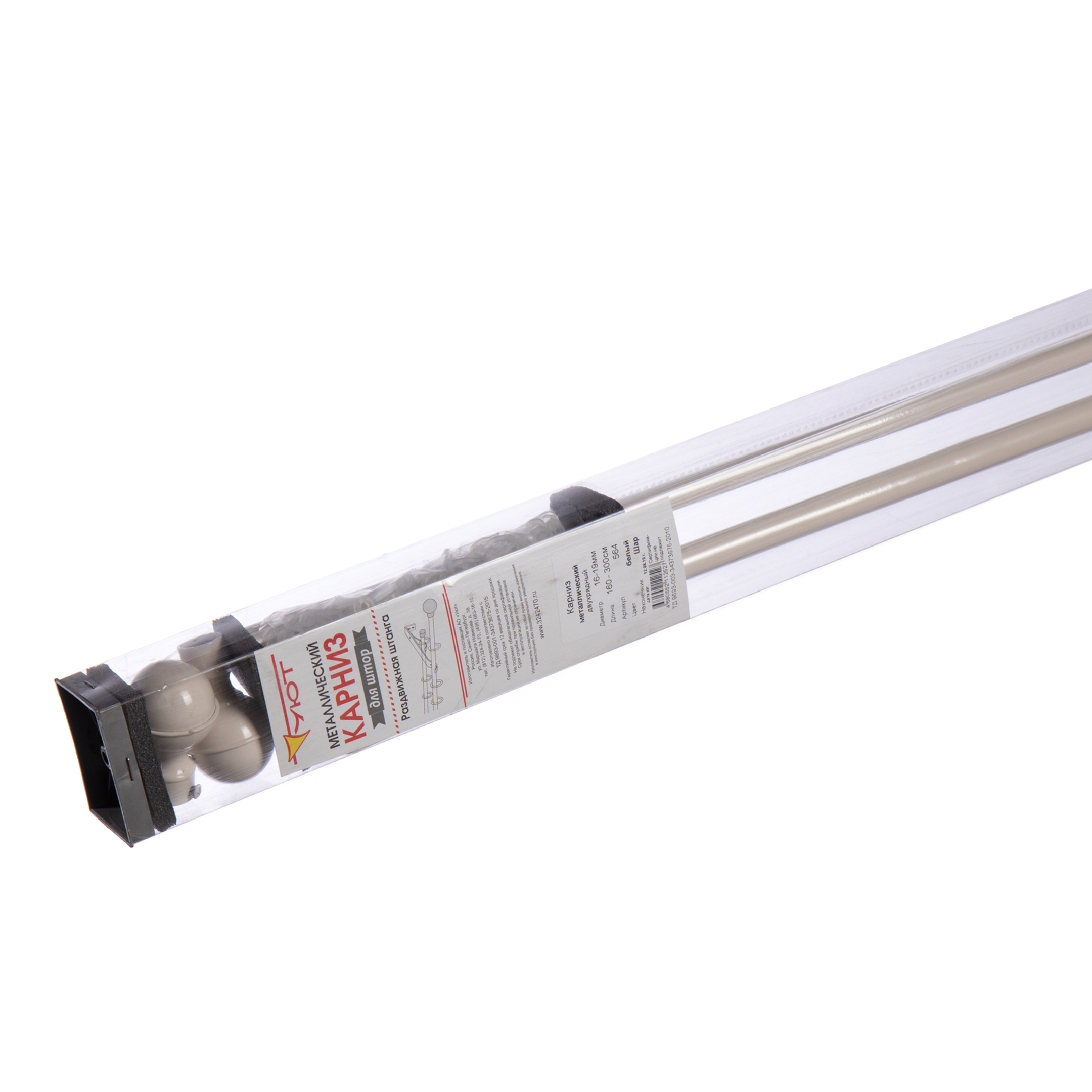 Штанга – 4 шт., Кронштейн – 3 шт., Кольцо – 60 шт., Крючок для колец – 60 шт., Наконечник – 2 шт., Комплект крепежа – 1шт., Инструкция – 1шт.