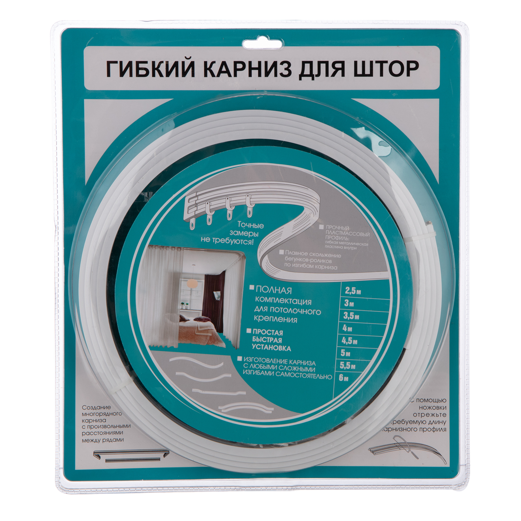 Однорядный гибкий шинный карниз Уютзамечательно подойдет для дизайнерского оформления интерьера. Прочный пластмассовый профиль снабжен гибкой металлической пластиной внутри, что позволяет придать карнизу любую форму. Вы сможете самостоятельно изготовить карниз с любыми сложными изгибами. Длина профиля регулируется – просто отрежьте ненужное. Такой карниз подходит для любых видов штор. Способ крепления потолочный.rnПолная комплектация для потолочного крепления. Простая и быстрая установка. Плавное скольжение бегунков-роликов по изгибам карниза.