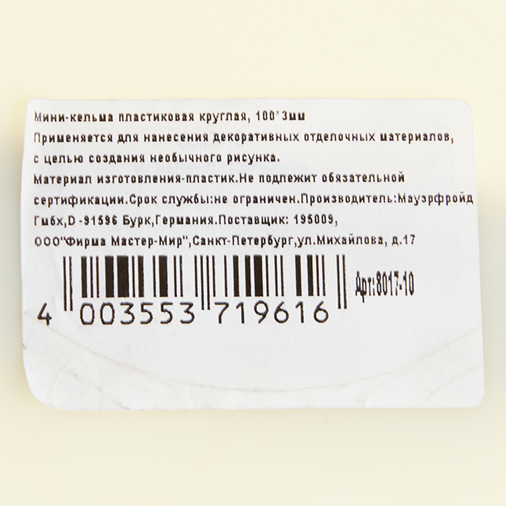 Мини-кельма средней жесткости предназначена для точной прорисовки фактуры текстурных красок. Изготовлена из пластика. Диаметр – 100 мм. В упаковке 1 шт.