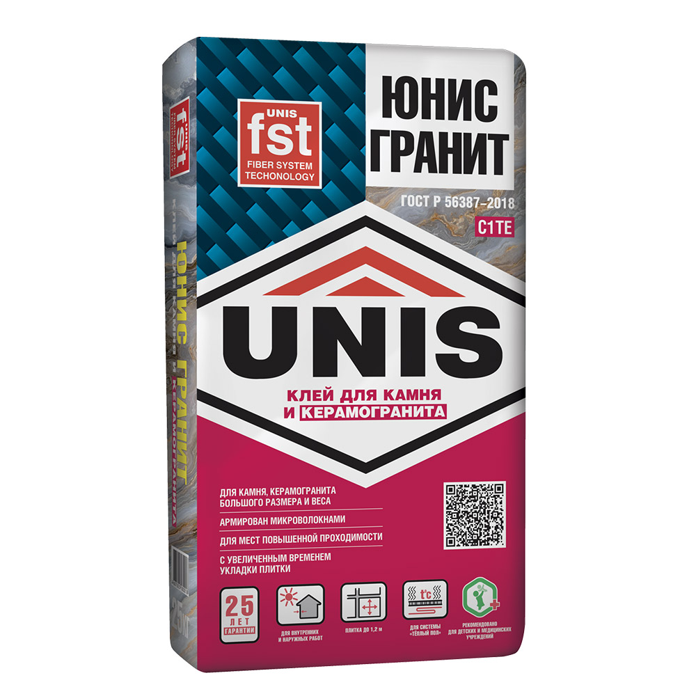 • укладки плитки на нанесённый клеевой слой составляет 30 минут. Положение плитки можно корректировать в течение 30 минут. Затирка швов плитки с помощью «UNIS COLORIT» – не ранее 24 часов после облицовки. При облицовке полов (шпателем 6х6 мм) хождение возможно через 24 часа после укладки плитки. Эксплуатация системы «Тёплый пол» возможна не ранее чем через 28 суток с момента нанесения материала.