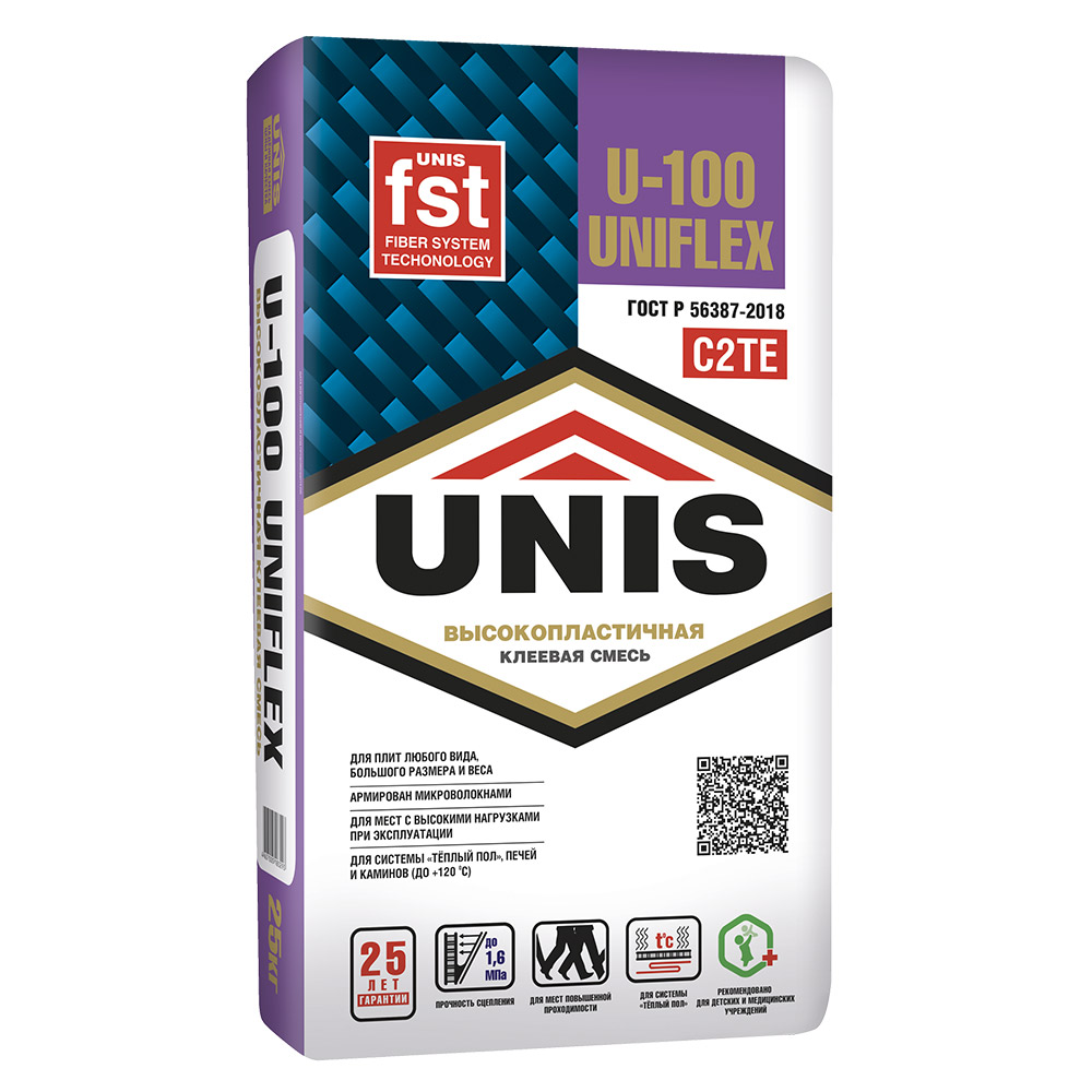 Клей для плитки, керамогранита и камня Unis Uniflex U-100 эластичный серый (класс С2) 25 кг