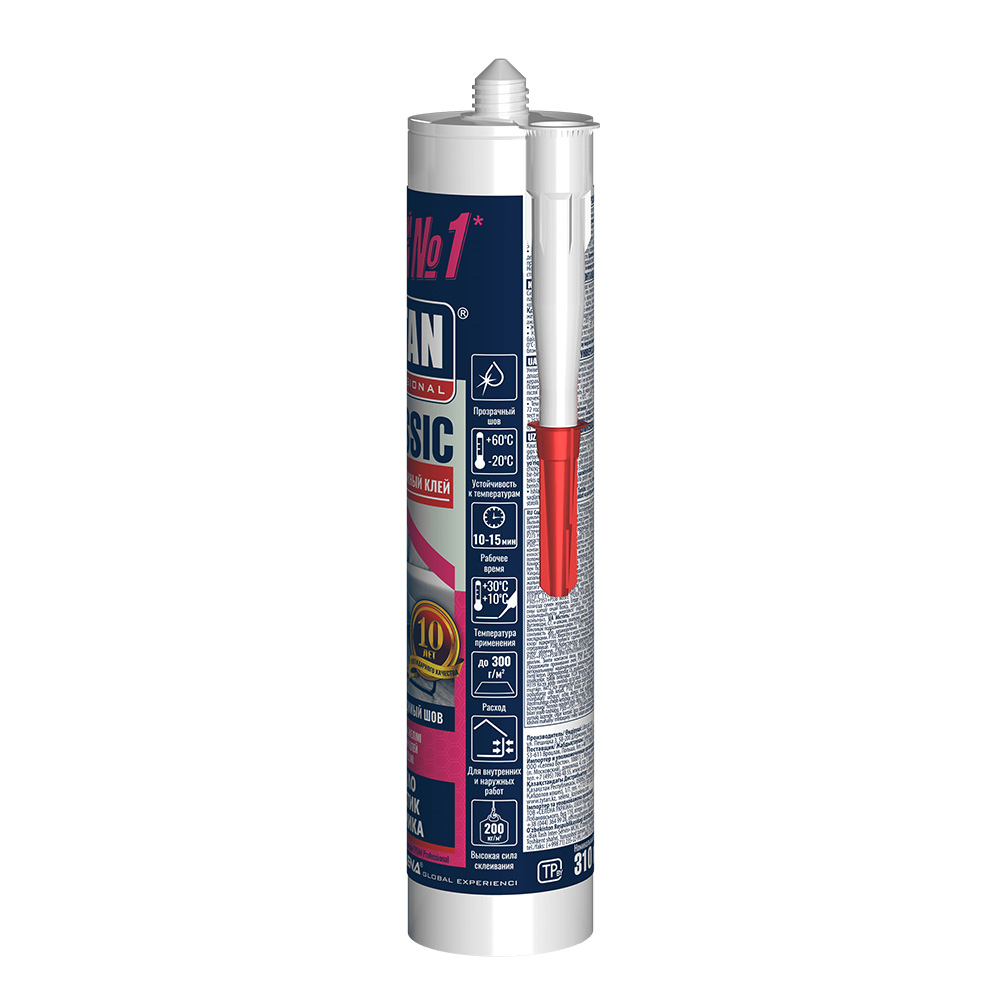 Многоцелевой прозрачный каучуковый монтажный клей. Рекомендуется для большинства строительных материалов для финишных и реконструкционных работ. После отверждения образует эластичный и прозрачный шов. Имеет отличную адгезию к типичным строительным основаниям, таким как: бетон, древесина, кирпич штукатурка. Не подлежит окрашиванию.