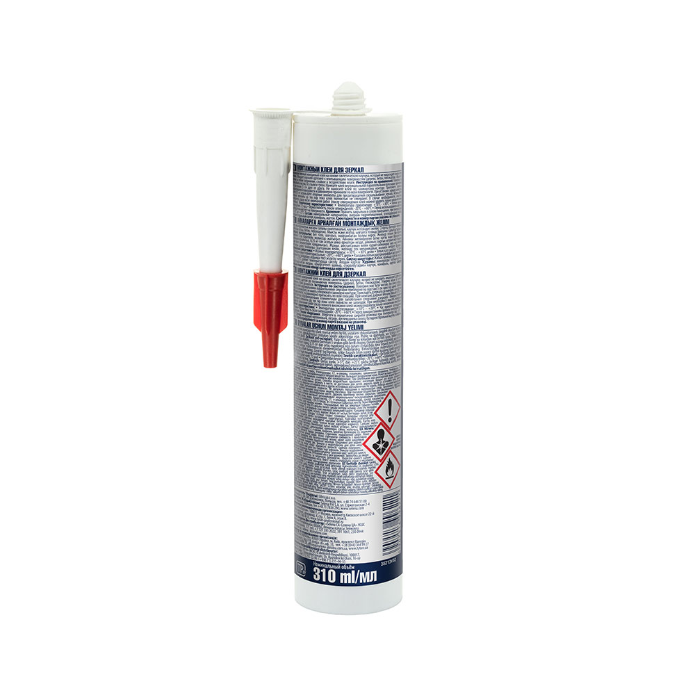 Обрезать наконечник картриджа чуть выше резьбы, привинтить насадку и вставить картридж в пистолет. Нанести клей на поверхность зеркала параллельными полосками с расстоянием 5 см и отступом 2 см от края зеркала. Соединить поверхности, равномерно и сильно прижать. Корректировка зеркала на 2-3 мм возможна в течение 5 мин с момента приклеивания. При вертикальном монтаже зеркал более 0,15м² рекомендуется использовать фиксирующие элементы. При монтаже тяжелых изделий из металла – нанести клей на одну из поверхностей, соединить склеиваемые элементы. Затем разъединить и выдержать 7-10 мин для улетучивания растворителя. После чего соединить и крепко прижать друг к другу элементы.
