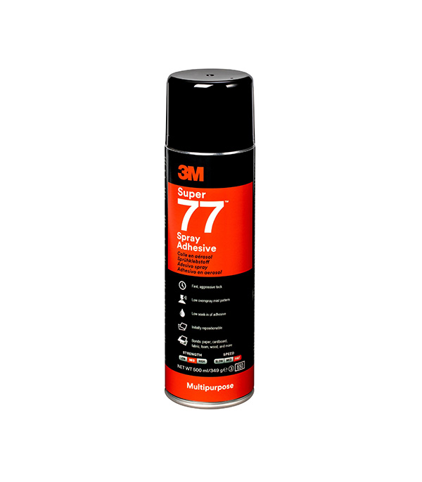 Аэрозольный клей 3M™ Scotch-Weld™ Super 77™ является промышленным универсальным клеем объемного распыления, предназначенным для различных видов применения. Он имеет высокую клеящую способность, высокую кроющую способность, быстрое высыхание и обеспечивает долговременную прочность склеивания.rnВысокое содержание сухого остатка и высокая кроющая способность.rnРецептура обеспечивает быстрое высыхание и активное прилипание для быстрого склеивания.rnСклеивает материалы за 15 секунд.rnОбладает хорошей тепло – и влагостойкостью, что обеспечивает защиту клеевого шва.rnОбразует временные и постоянные связи на поверхности бумаги, картона, тканей, пеноматериалов, дерева, металла, стекла и большинства пластмасс.