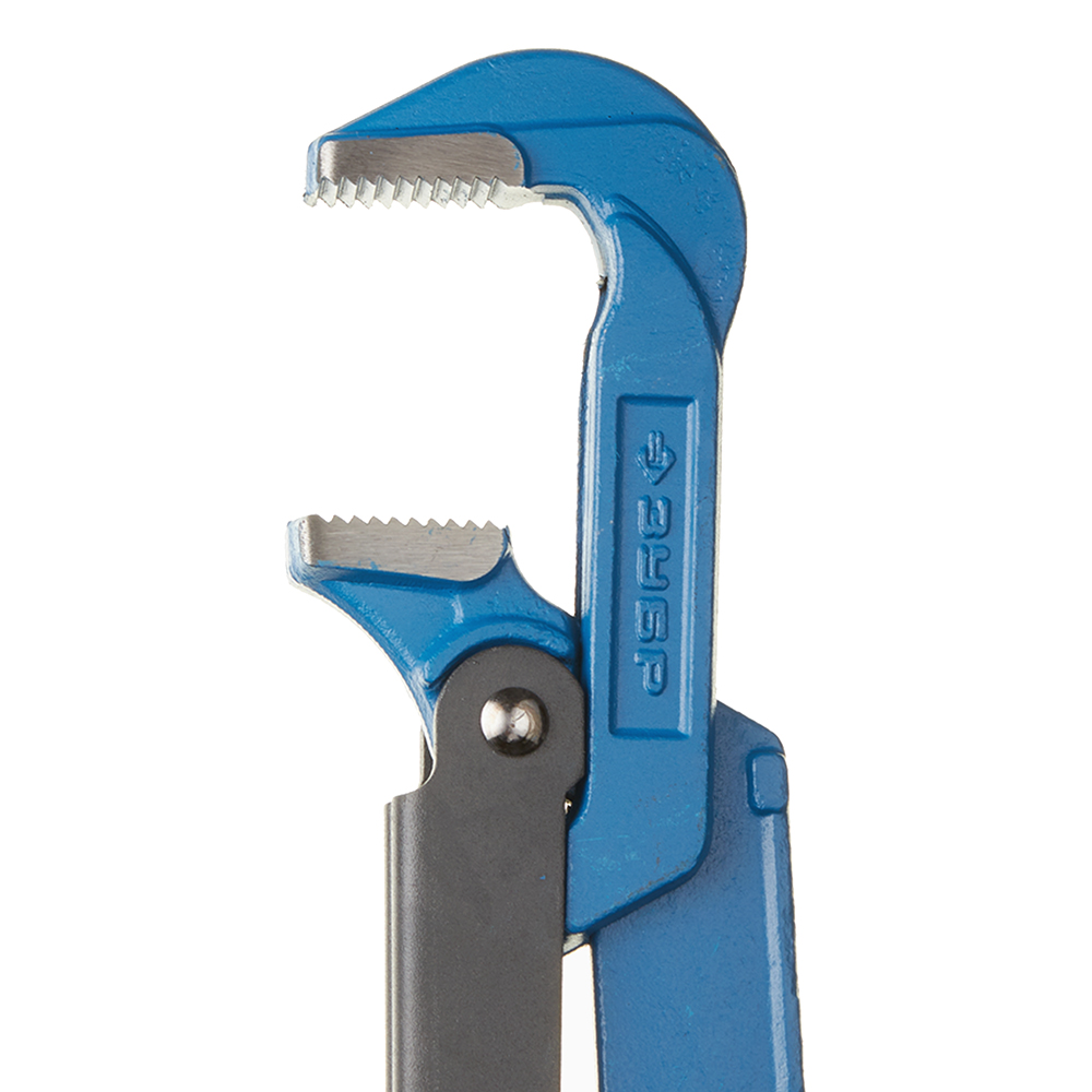 Ключ трубный предназначен для работ с трубами и крепежом различной формы и размера. Имеет длительный срок службы.rnЦельнокованая конструкция и специальная форма губок позволяют применить инструмент при больших нагрузках. Выполнен из высококачественной хромованадиевой стали.rnДля увеличения износостойкости зубцы подвергнуты индукционной закалке токами высокой частоты до твердости 53 – 59 HRC.rnУгол наклона зубьев обеспечивает максимально возможное усилие захвата. Максимальный захват – 38 мм.rnПредохранительный стопор для регулировочной гайки препятствует ее полному откручиванию.