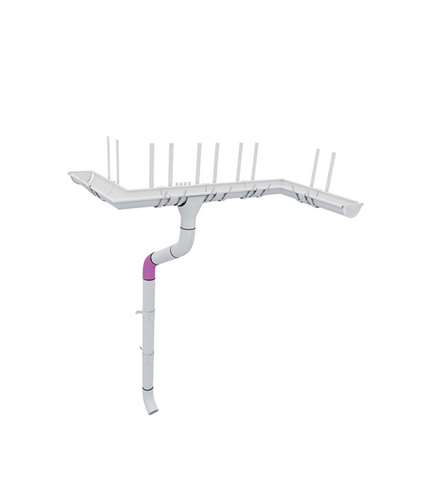 Соединить колено трубы, трубу водосточную, при необходимости трубу соединительную и колено слива. Выровнять конструкцию, затем присоединить водосточную систему к воронке. Отрегулировать и защелкнуть замки кронштейнов.