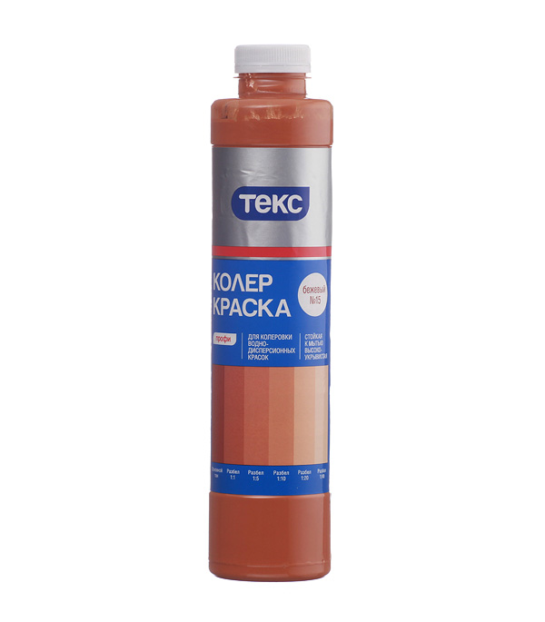 смешать колер краску с белой водно-дисперсионной краской. Оттенок заколерованной краски зависит от типа колеруемого материала. При окраске поверхностей с большой площадью рекомендуется предварительно смешать необходимое количество заколерованной краски в одной емкости для обеспечения равномерного тона (как минимум для окрашивания в 1 слой).