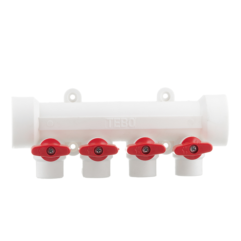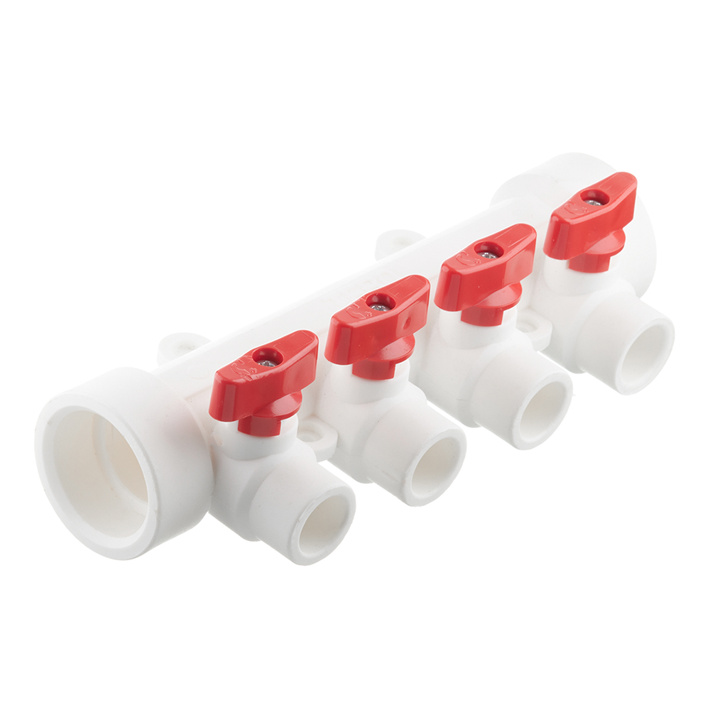 Предназначен для равномерного распределения и поступления воды от главного трубопровода по полипропиленовым трубам к сантехнике и другим потребителям без потери напора воды.rnПозволяет изолировать часть системы в случае неисправностей и проводить ремонт, не производя при этом общего отключения водоснабжения.rnИспользуется для разделения потока воды из одной трубы на четыре линии, путем присоединения полипропиленовых труб диаметром 20 мм. Ручки красного цвета.rnМежосевое расстояние между отводами 46 мм.