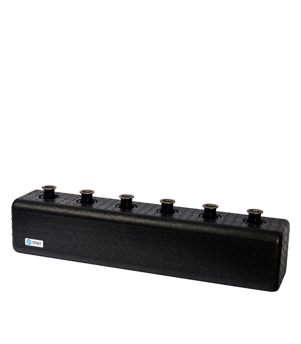 Стальной распределительный коллектор STOUT в теплоизоляции предназначен для монтажа насосных групп и рассчитан на 3 отопительных контура. Распределительный коллектор STOUT представляет собой одну стальную коробчатую трубу прямоугольного сечения вместо обычно двух, к которой снизу и сверху соосно приварены парные патрубки (входные и выходные). Внутри трубы выполнены фигурные перегородки для разграничения прямого и обратного потоков теплоносителя и организации распределения его между всеми выходными патрубкам коллектора. Зигзагообразная форма перегородок позволила расположить патрубки вдоль одной оси коллектора. Верхние патрубки коллектора оснащены накидными гайками для обеспечения быстрого соединения, как правило, с насосными узлами гидромодуля, а нижние – имеют наружную резьбу. В коллектор встроен гидравлический разделитель. Двухслойная пенопластовая теплоизоляция. В комплект поставки входят элементы крепежа и уплотнительные модули.