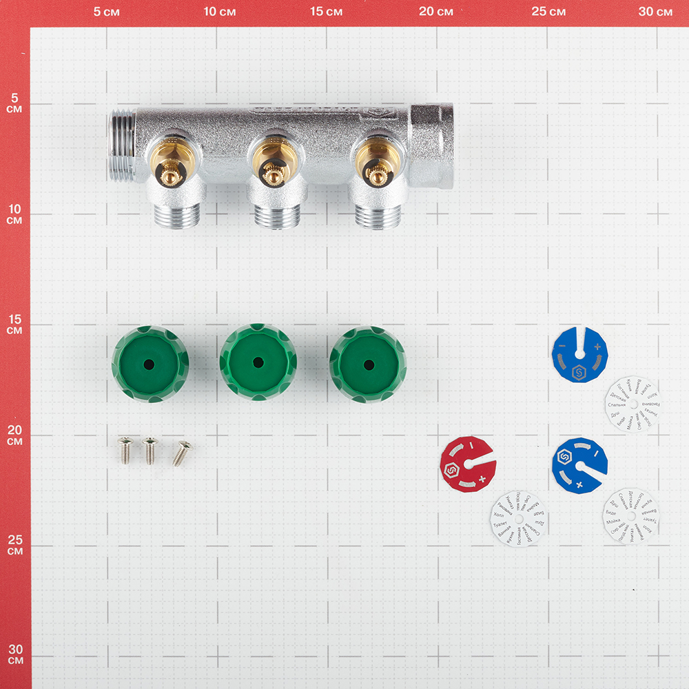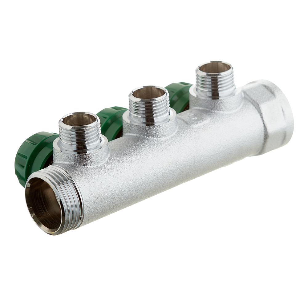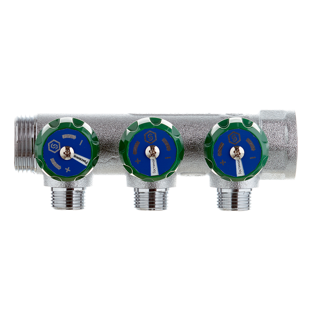 Коллекторы распределительные с регулировочно-отсечными клапанами для системводоснабжения и отопления, тип SMВ 6849(50) STOUT – предназначены для распределения потока транспортируемой среды по потребителям путем перекрытия клапанов на отводах. Коллекторы могут использоваться на трубопроводах систем отопления, холодного и горячего водоснабжения, а также для транспортировки жидкости, не агрессивной к материалам элементов коллекторных систем. Распределительные коллекторы могут иметь два, три или четыре выхода с наружной резьбой 1/2а также соединения 3/4для евроконуса, и 1/2под плоское уплотнения. Коллекторы соединяются по принципу модульности.
