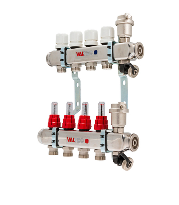 Коллектор 1внутр(г)х6 отводов 3/4нар(ш) х 1внутр(г) с термостатическими клапанами, коллектор 1внутр(г)х6 отводов 3/4нар(ш) х 1внутр(г) с расходомерами, воздухоотводчик – 2 шт., отсекающий клапан воздухоотводчика – 2 шт., дренажный поворотный кран – 2 шт., кронштейн для монтажа коллекторов – 2 шт.