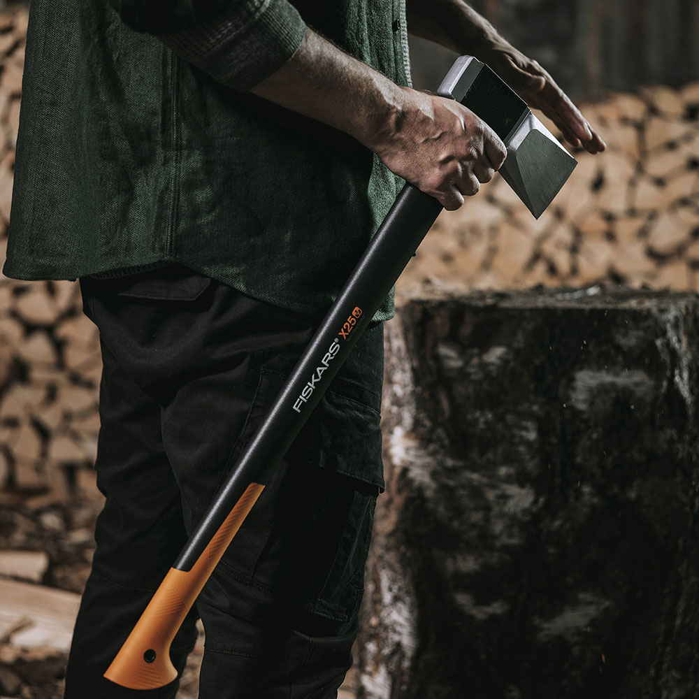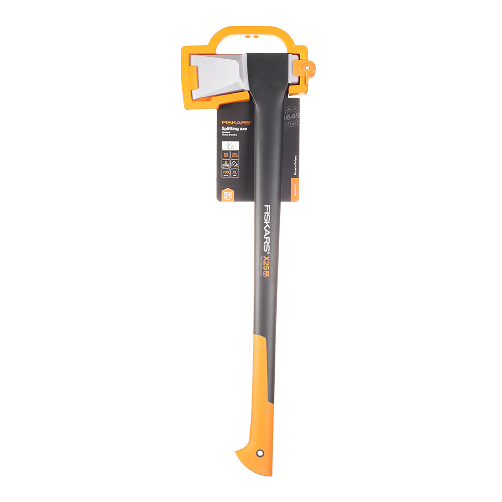 Передовой дизайн в сочетании с формой лезвия, современными материалами и прочностью делают топоры FISKARS оптимальным решением для самой тяжёлой работы. Среди большого ассортимента от универсальных топоров меньших размеров до самых больших топоров вы можете выбрать подходящий инструмент для заготовки веток или колки дров. Топоры-колуны Fiskars – это истинная эволюция мастерства колки – одного удара достаточно, чтобы расколоть даже большое бревно. Форма и покрытие лезвия, легкое и прочное топорище, оптимальный баланс центра тяжести – выберите подходящий топор именно для вашей задачи. Топор – колун имеет уникальный рубящий край, который легко врезается в дерево, а благодаря широкому клину лезвия колун без проблем вытаскивается из полена.rn Топор-колун Х25 подходит для колки больших поленьев диаметром более 30 см. Тяжелое лезвие разрубает даже самые большие поленья без проблем. Эффективное использование этой модели требует определенного опыта.rn Благодаря выпуклой форме клина топор легче вытащить из бревна.rn Отшлифованное лезвие с двойной степенью закалки обеспечивает максимальную прочность.rn Антифрикционное покрытие защищает лезвие от коррозии.rn Лезвие надежно зафиксировано в топорище и не сорвется. rn Оптимальный баланс между лезвием и топорищем для безопасной, удобной и эффективной работы.rn Легкое, прочное и износоустойчивое топорище из материала FiberComp™.rn Амортизирующее структурное покрытие SoftGrip™ обеспечивает удобный захват.rn Крючкообразная форма рукоятки предотвращает выскальзывание инструмента.rn Топор снабжен практичным пластиковым чехлом для удобства хранения и переноски.rn Топор произведен в Финляндии.rn Гарантия 25 лет при регистрации на сайте www.fiskars.ru.