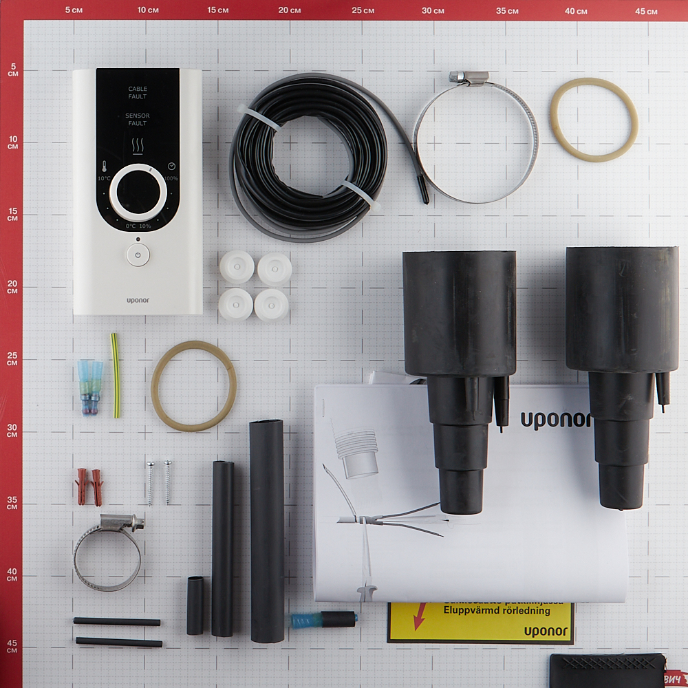 Предназначен для для подключения и окончания греющего кабеля, два резиновых концевых уплотнителя с комплектами колец и хомутов, блок управления Supra Plus и датчик температуры. Фитинги для несущей трубы в комплект не входят.