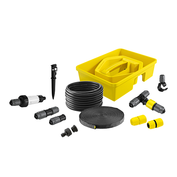 сочащийся шланг – 10 м; шланг Karcher Rain System – 15 м, 1/2для подачи воды и установки форсунок; фильтр – 1 шт; T-образный тройник с регулятором – 4 шт.; соединитель – 4 шт.; заглушка – 5 шт.; капельницы – 10 шт.; колышки – 5 шт.; коннектор – 2 шт.; коннектор для крана G1 с переходом на G 3/4 – 1 шт.