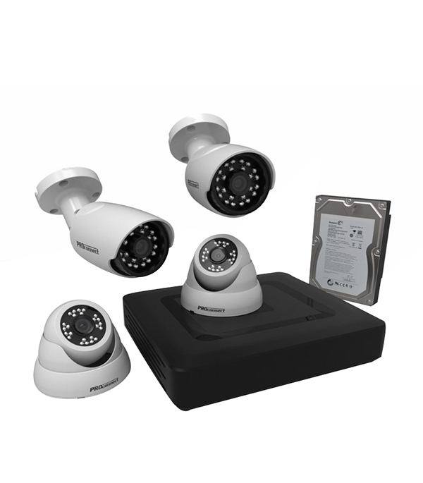 Предназначен для создания системы безопасности на охраняемых объектах. Готовый для установки комплект видеонаблюдения ProConnect с жестким диском, состоящий из 2-х всепогодных AHD видеокамер, 2-х купольных AHD видеокамер внутренней установки и 4-х канального AHD видеорегистратора со скоростью записи 100к/с и возможностью работы с AHD и аналоговыми видеокамерами. Видеокамеры оснащены высокочувствительной матрицей, предоставляющей превосходное качество изображения. Оборудование работает на основе новейшей технологии AHD, позволяющей передавать изображение с разрешением от 720P по коаксиальному кабелю на расстояние до 500 м без задержек и потерь. Расшифровка маркировки: AHD -аналоговый сигнал высокой четкости, AHD-M -разрешение 720p.
