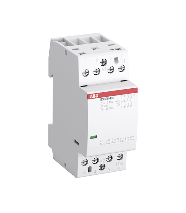 ESB – название серии; 25А – номинальный ток; 4НО – четыре нормально разомкнутых (нормально-открытых) контакта; АВВ – фирма производитель.