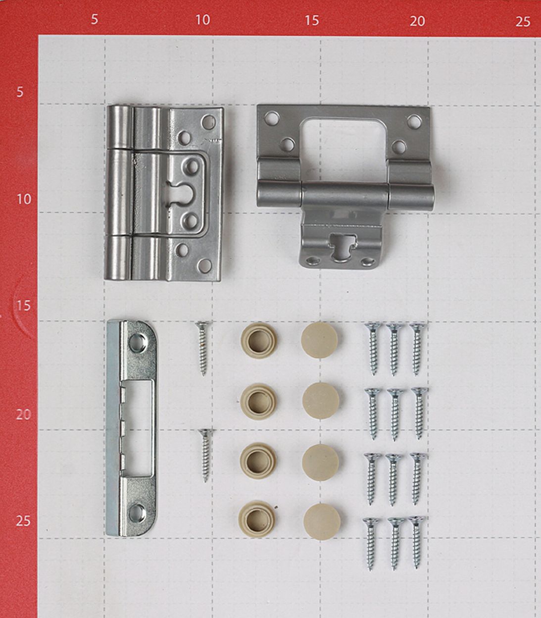 коробка шириной 80 мм без порога (две стойки и одна верхняя перекладина), 2 накладные петли, саморезы – 12 шт, ответная планка под замок, заглушки – 8 шт.