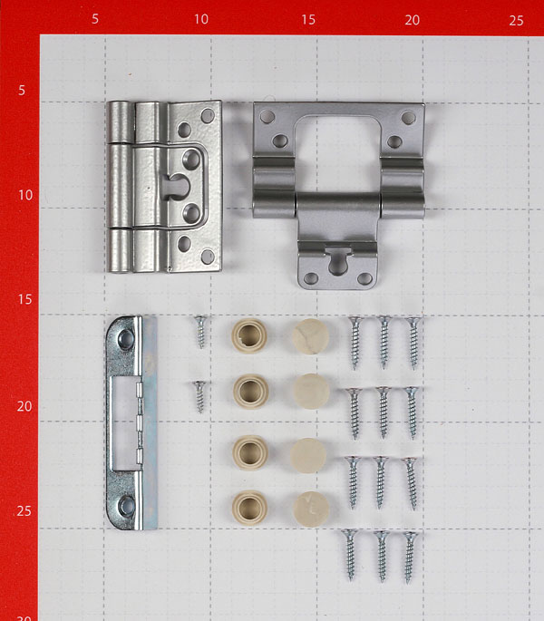 коробка шириной 80 мм без порога (две стойки и одна верхняя перекладина), 2 накладные петли, саморезы – 12 шт, ответная планка под замок, заглушки – 8 шт.