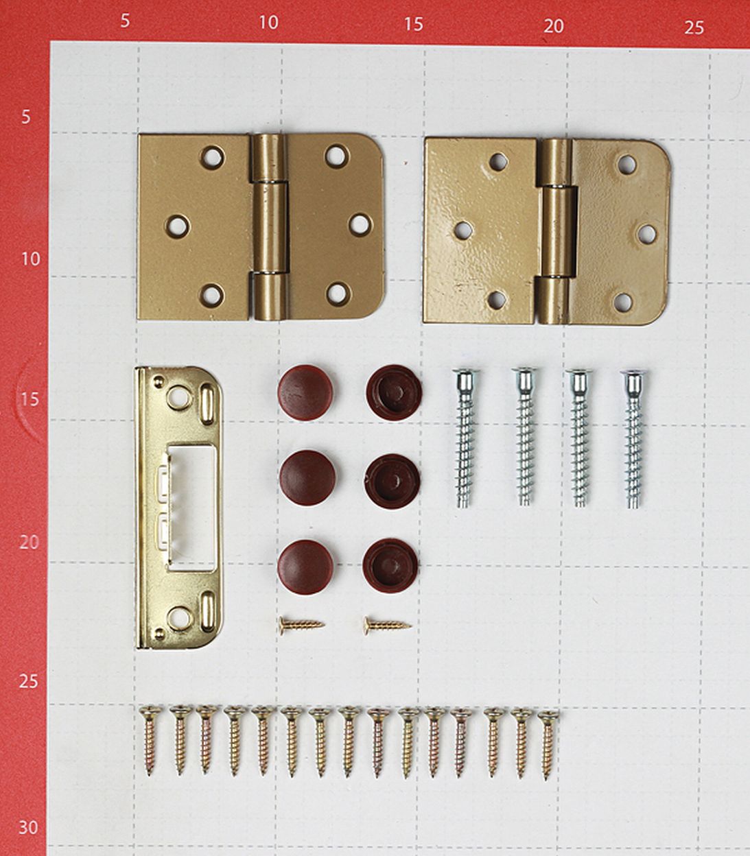 Стойка петлевая 26х70хх2070 мм, стойка ответная 26х70хх2070 мм, верхняя перекладина 26х70хх749 мм, 2 универсальные ввертные петли, конфирматы, ответная планка, заглушки.