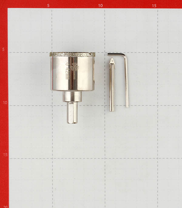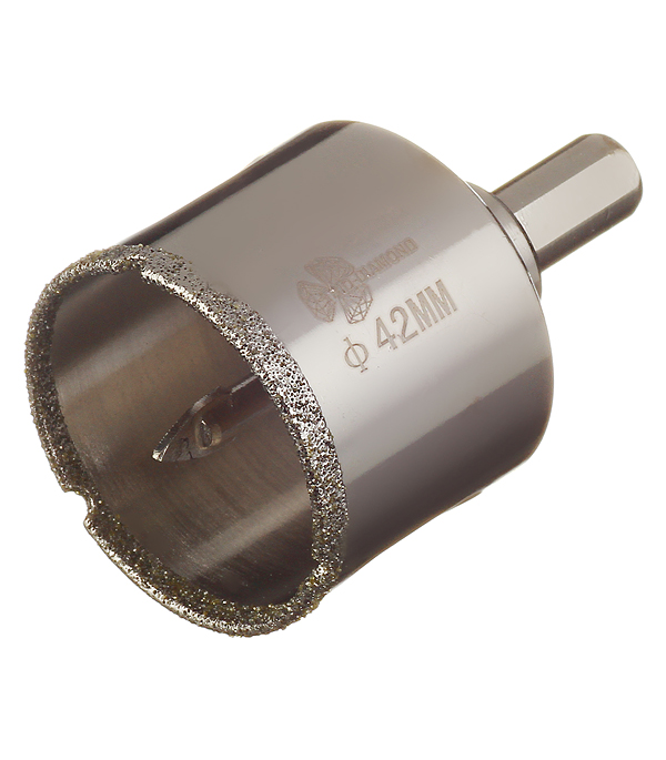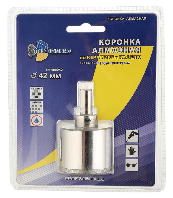 Предназначена для сверления отверстий в керамической, керамогранитной и кафельной плитке при обязательном водяном охлаждении. rnРавномерное распределение зерна на поверхности рабочей части обеспечивает аккуратное сверление материала без трещин и сколов. rnВ комплект входит центрирующее сверло, которое исключает возможность смещения инструмента во время работы.rnМатериал абразива – синтетические алмазы, зерно 60