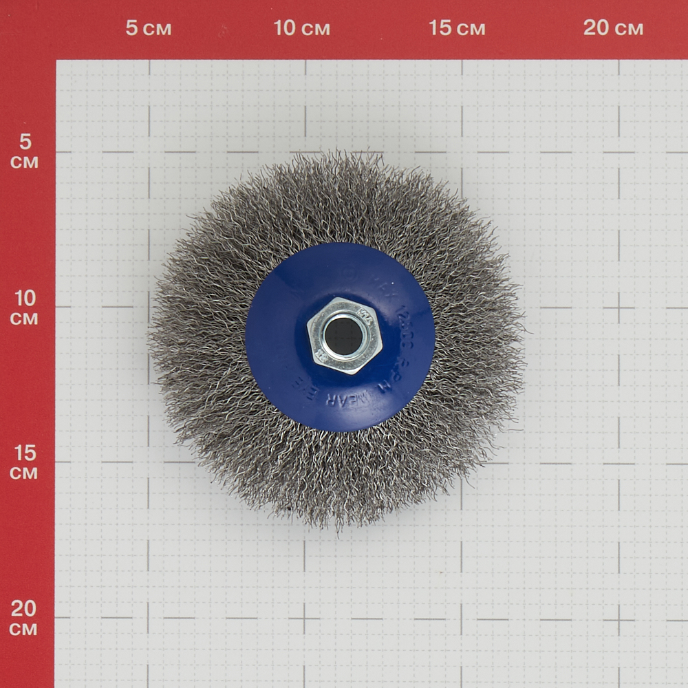 Кордщетка для угловых шлифмашин. Резьбовая посадка на шпиндель. Гофрированная стальная проволока. Для обработки деревянных и металлических поверхностей в труднодоступных местах, снятия краски, ржавчины, обработки сварных швов.