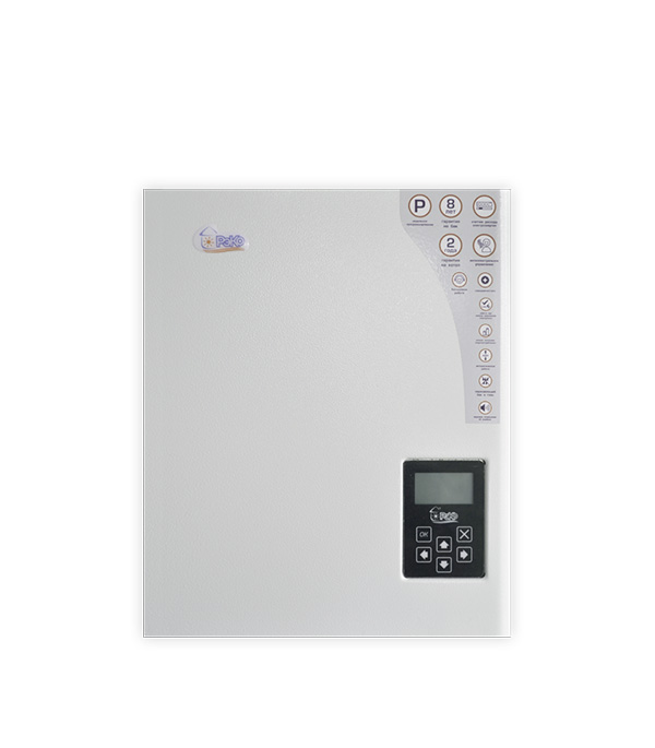 Электрический одноконтурный отопительный котел Российского производства РЭКО от производителя электрокотлов «РусНИТ» предназначенный для создания комфортных условий пребывания в жилых и производственных помещениях. rnЭлектрическое отопление является экологически чистым и не осуществляет выбросов в атмосферу.rnПредусмотрена как автоматическая так и ручная регулировка мощности: 6/6/12 кВт. Присоединительный размер патрубков 1. rnЭлектрокотел РЭКОотличается современным дизайном, надежной конструкцией (бак и тэны из нержавеющей стали) и отличным функционалом (недельное программирование, счетчик расхода электроэнергии).rnКоммутация ТЭНов в котле осуществляется при помощи полупроводников — это гарантирует большой ресурс, бесшумную работу, исключает вероятность подгорания контактов и радиопомех.rnГруппы ТЭНов позволяют выполнять равномерную трехступенчатую регулировку по мощности без перекоса фаз. Устойчиво работают при пониженном напряжении. Допускается использование котла совместно с системами «теплый пол» (точность датчика 0,5 С). rnУправление электрическим котлом РЭКО осуществляется при помощи функциональной панели с ЖК-дисплеем, имеющей все необходимые индикации (информация о текущих температурах, режимах работы и неисправностях). rnКонструкция котла позволяет использовать в качестве теплоносителя, как воду, так и антифриз (предназначенный для бытовых систем отопления). rnЭлектрокотлы «РЭКО» полностью соответствуют требованиям по безопасности ГОСТ.