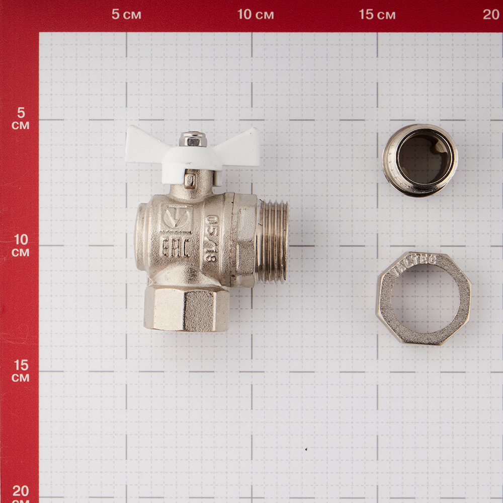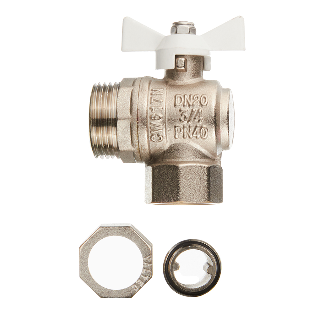 Предназначен для полного открытия или закрытия потока воды. Полнопроходной, ремонтопригодный, с увеличенным ресурсомrnСоединен накидной гайкой с резьбовым полусгоном. Корпуса деталей – латунные, никелированные.rnКран оснащен ручкой типа «бабочка» с утолщенной стенкой из алюминиевого сплава и эпоксидным покрытием белого цвета.rnРезьба присоединений – внутренняя/наружная.
