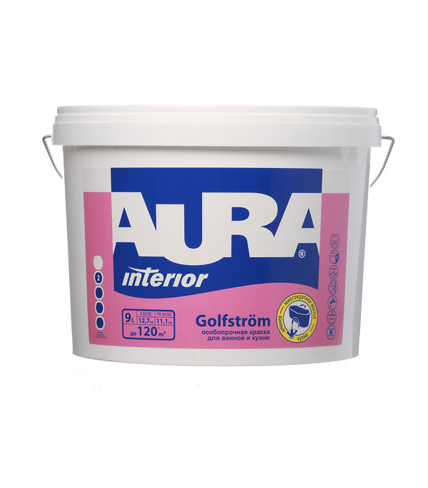Краска водно-дисперсионная Aura Interior Golfstrom особопрочная для ванной и кухни моющаяся белая основа А 9 л