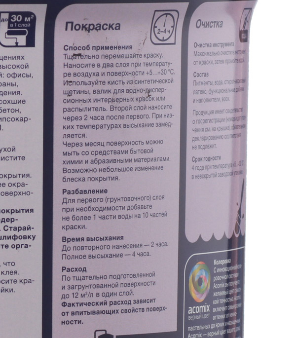 Колеруется согласно каталогам SP4, SP5, RAL, Colornorm в светлые пастельные тона. Услуга высококачественной колеровки займет до 10 минут для одной банки. Может самостоятельно использоваться как белая краска.