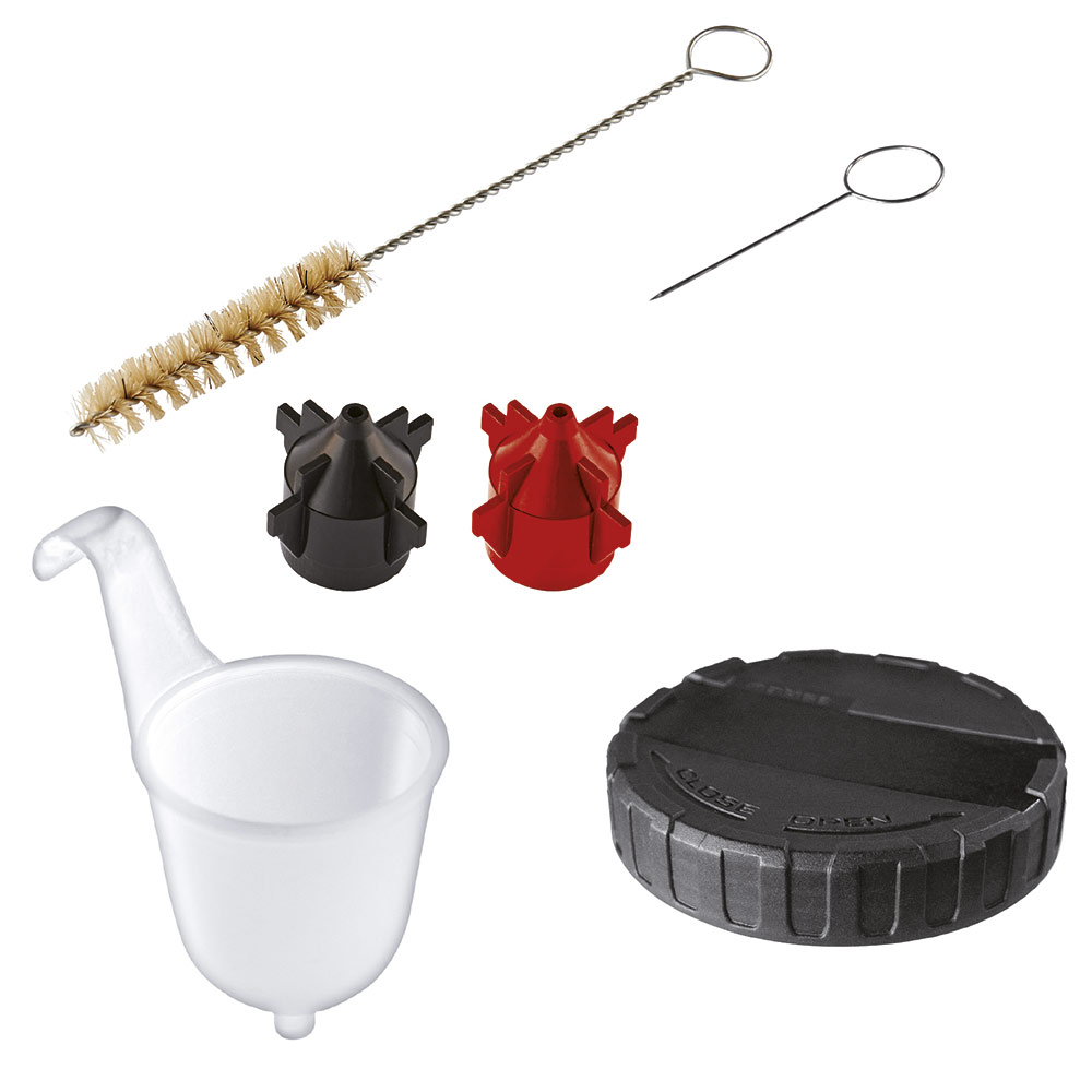 краскопульт, распыляющие насадки 2 мм и 2.5 мм, щетка и игла для прочистки, резервуар для пробы вязкости, упаковка.