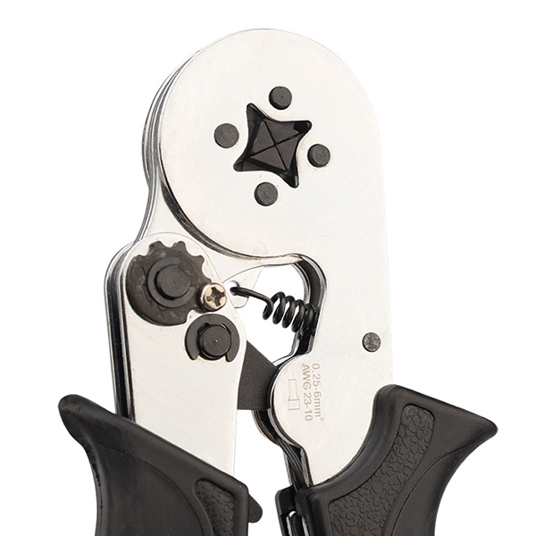 Предназначен для опрессовки штыревых наконечников в диапазоне 0.25-6.0 мм². rnЧетырехсегментная саморегулирующая матрица с системой поворотных кулачков диафрагменного типа.rnКлещи имеют настройку давления опрессовки и принудительно размыкающуюся блокировку, которая не позволяет разойтись рукояткам до полной опрессовки, т. е. контролирует качество контактного соединения.rnХраповой механизм, гарантирует полный цикл качественной опрессовки. rnКорпус выполнен из закаленной инструментальной стали (сплав хрома и ванадия) и имеет закругленные линии корпуса для удобства и безопасного использования. rnРукоятки выполнены из плотного синтетического покрытия с резиновыми вставками, благодаря которому руки не будут скользить.