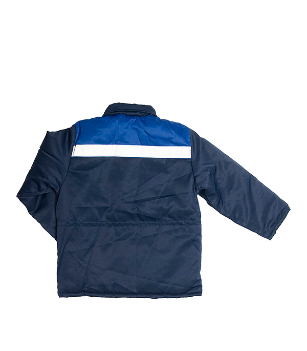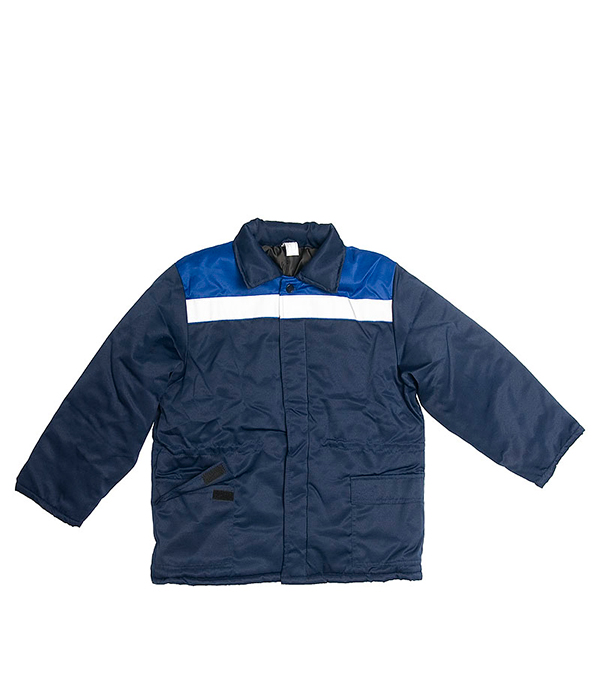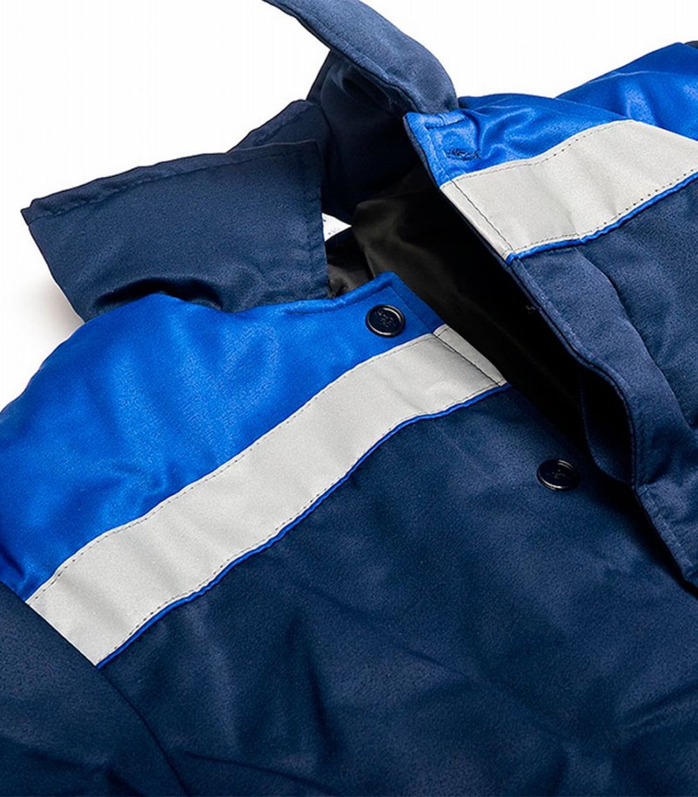Куртка утепленная с потайной застежкой на пуговицах. Спереди внизу два кармана с клапаном, один внутренний карман, на поясе кулиска (стяжной эластичный шнур с двумя стопорами), в верхней части (грудь, спина) светоотражающая полоса. Цвет: темно-синий, дополнительный (кокетка) – василек. Куртка предназначена для использования в качестве защитной спецодежды при проведении строительных и других работ.