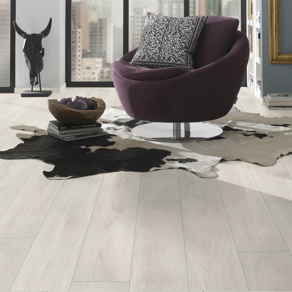 Перед монтажом ламинат необходимо выдержать в помещении в течение нескольких дней, чтобы он адаптировался к влажности и температуре. При настилке ламината на бетон необходимо, как и в случае с деревянным полом, провести проверку его горизонтальности. Неровности более 3 мм должны быть устранены. Далее на поверхность основания необходимо уложить теплозвукоизоляционный материал (вспененную или пробковую подложку). Затем вдоль стен устанавливаются распорные клинья толщиной около 10 мм, которые послужат будущим зазором. После окончания работ клинья вынимаются. Зазоры необходимы для того, чтобы в результате теплового расширения ламинат не «встал дыбом». Итак, первую доску кладем в угол стены. Далее к ней с торцевой (более короткой) стороны под углом около 30 градусов пазом вставляется следующая панель и защелкивается путем нажатия панели к полу. Так продолжаем до конца стены. Торцевые швы следующего ряда необходимо сместить минимум на 30-40 см относительно предыдущего ряда, чтобы добиться шахматного порядка. Это требуется для равномерного распределения давления на панели. Второй ряд точно также соединяем между собой торцевыми более короткими сторонами, НЕ состыковывая с первым рядом. Затем соединяем ряды между собой. Для этого уже соединенные между собой панели второго ряда приподнимаем над полом на несколько сантиметров, вставляем в гребень первого ряда (также под углом примерно в 30?) и защелкиваем нажатием к полу.