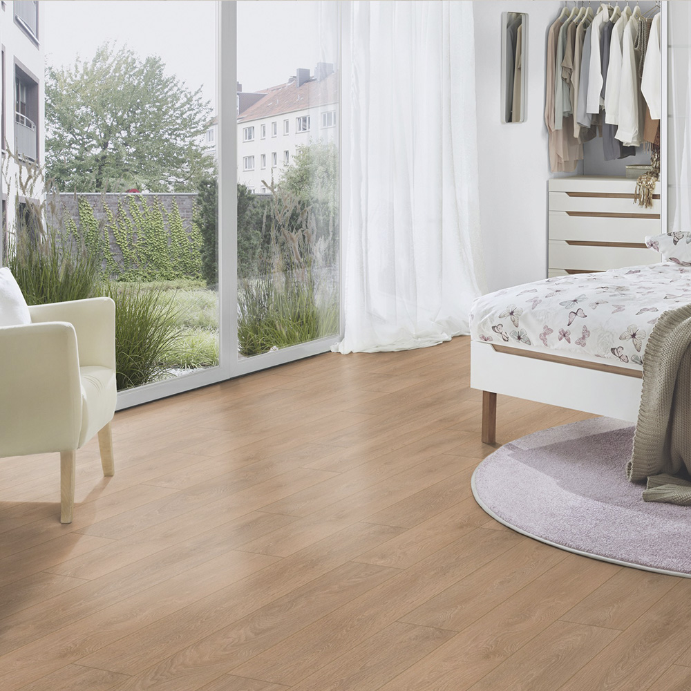 Перед монтажом ламинат необходимо выдержать в помещении в течение нескольких дней, чтобы он адаптировался к влажности и температуре. При настилке ламината на бетон необходимо, как и в случае с деревянным полом, провести проверку его горизонтальности. Неровности более 3 мм должны быть устранены. Далее на поверхность основания необходимо уложить теплозвукоизоляционный материал (вспененную или пробковую подложку). Затем вдоль стен устанавливаются распорные клинья толщиной около 10 мм, которые послужат будущим зазором. После окончания работ клинья вынимаются. Зазоры необходимы для того, чтобы в результате теплового расширения ламинат не «встал дыбом». Итак, первую доску кладем в угол стены. Далее к ней с торцевой (более короткой) стороны под углом около 30 градусов пазом вставляется следующая панель и защелкивается путем нажатия панели к полу. Так продолжаем до конца стены. Торцевые швы следующего ряда необходимо сместить минимум на 30-40 см относительно предыдущего ряда, чтобы добиться шахматного порядка. Это требуется для равномерного распределения давления на панели. Второй ряд точно также соединяем между собой торцевыми более короткими сторонами, НЕ состыковывая с первым рядом. Затем соединяем ряды между собой. Для этого уже соединенные между собой панели второго ряда приподнимаем над полом на несколько сантиметров, вставляем в гребень первого ряда (также под углом примерно в 30?) и защелкиваем нажатием к полу.