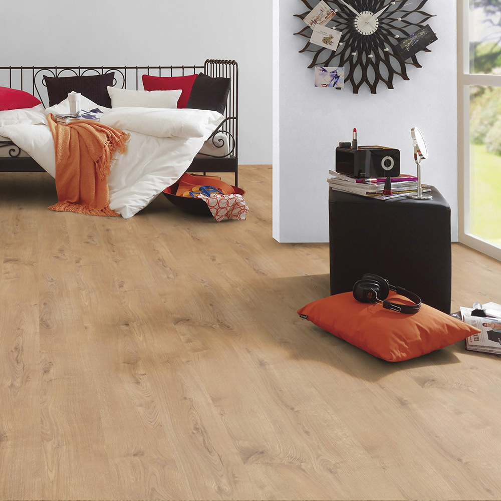 Перед монтажом ламинат необходимо выдержать в помещении в течение нескольких дней, чтобы он адаптировался к влажности и температуре. При настилке ламината на бетон необходимо, как и в случае с деревянным полом, провести проверку его горизонтальности. Неровности более 3 мм должны быть устранены. Далее на поверхность основания необходимо уложить теплозвукоизоляционный материал (вспененную или пробковую подложку). Затем вдоль стен устанавливаются распорные клинья толщиной около 10 мм, которые послужат будущим зазором. После окончания работ клинья вынимаются. Зазоры необходимы для того, чтобы в результате теплового расширения ламинат не «встал дыбом». Итак, первую доску кладем в угол стены. Далее к ней с торцевой (более короткой) стороны под углом около 30 градусов пазом вставляется следующая панель и защелкивается путем нажатия панели к полу. Так продолжаем до конца стены. Торцевые швы следующего ряда необходимо сместить минимум на 30-40 см относительно предыдущего ряда, чтобы добиться шахматного порядка. Это требуется для равномерного распределения давления на панели. Второй ряд точно также соединяем между собой торцевыми более короткими сторонами, НЕ состыковывая с первым рядом. Затем соединяем ряды между собой. Для этого уже соединенные между собой панели второго ряда приподнимаем над полом на несколько сантиметров, вставляем в гребень первого ряда (также под углом примерно в 30?) и защелкиваем нажатием к полу.