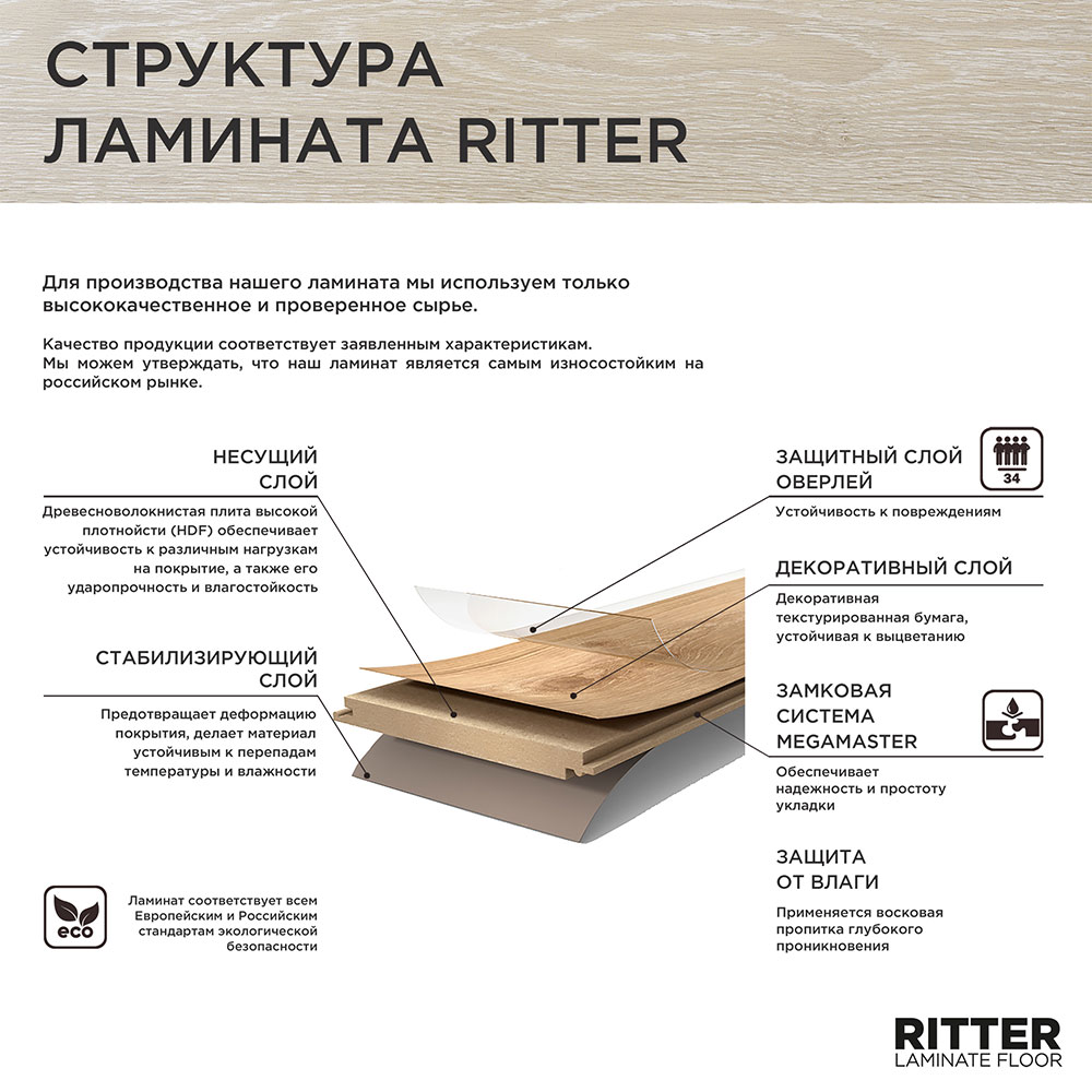 – 34 класс износостойкости применяется в промышленных и спортивных сооружениях, а также в помещениях с высокой проходимостью. Однако этот ламинат подходит не только для коммерческой эксплуатации: в жилых пространствах такой пол прослужит гораздо дольше покрытия для домашнего использования. rn– Замковое соединение MEGAMASTER обеспечивает надежность и простоту укладки, а за счет воскосодержащей пропитки глубокого проникновения покрытие не боитсяводы и других жидкостей. rn– Ламинат с толщиной доски 12 мм менее требователен к подготовке основания пола и выдерживает более тяжелые нагрузки мебели. rn– Ламинат ТМ «Ritter» имеет высший из возможных на данный момент классов огнестойкости – КМ2 и рекомендован к использованию на любых объектах, требующих повышенного пожарного контроля.